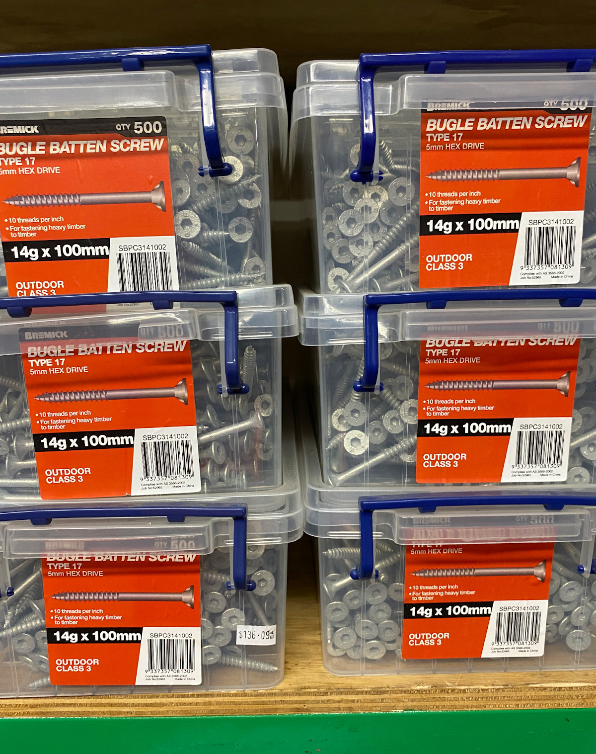 Built tough for the outdoors, Bremick Bugle Batten Screws deliver serious holding power and long-lasting durability. Featuring a strong hex head for easy driving and maximum torque, these screws make light work of heavy-duty timber fixing. Coated in a Class 3 outdoor protection, they’re engineered to resist rust and corrosion even in harsh Australian conditions. The bugle head design ensures a clean, flush finish, while the coarse thread bites deep for a secure hold. Ideal for decks, fencing, and outdoor construction, Bremick Bugle Batten Screws give you the strength and reliability you can count on—job after job.