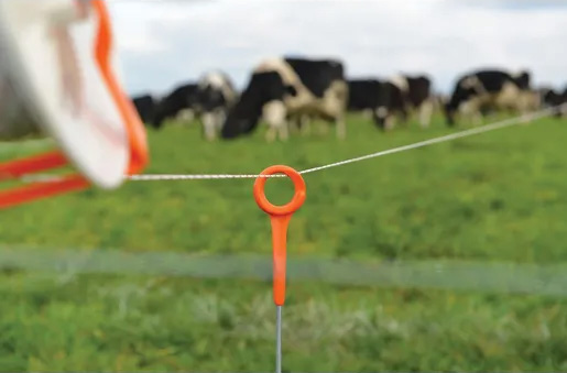 The glass-reinforced nylon Ring Top head eliminates any risk of shorting or wear-through, with no metal in the head for maximum safety and durability. Its unique centered design prevents tangling, making handling and setup easier, and the Ring Top head also doubles as a convenient handle for quick relocation. A steel foot spike provides excellent ground grip and prevents rotation once inserted.