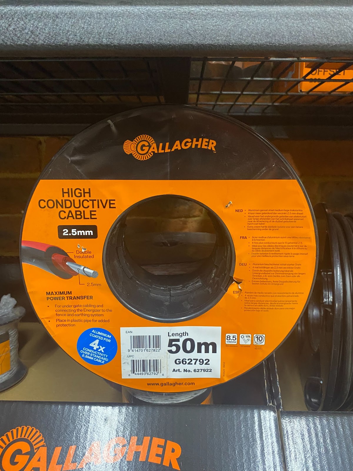 The Gallagher High Conductive Insulated Cable 2.5mm x 50m (G62792) is a premium-grade connection cable designed to deliver maximum power efficiency across your electric fence system. Constructed with 2.5mm aluminium-coated wire, it provides four times the conductivity of standard galvanised wire, ensuring minimal power loss over long distances. The heavy-duty double insulation features a tough polyethylene outer layer, offering superior abrasion resistance and protection against wear — ideal for both above-ground and underground use (recommended to be laid in plastic conduit when buried).