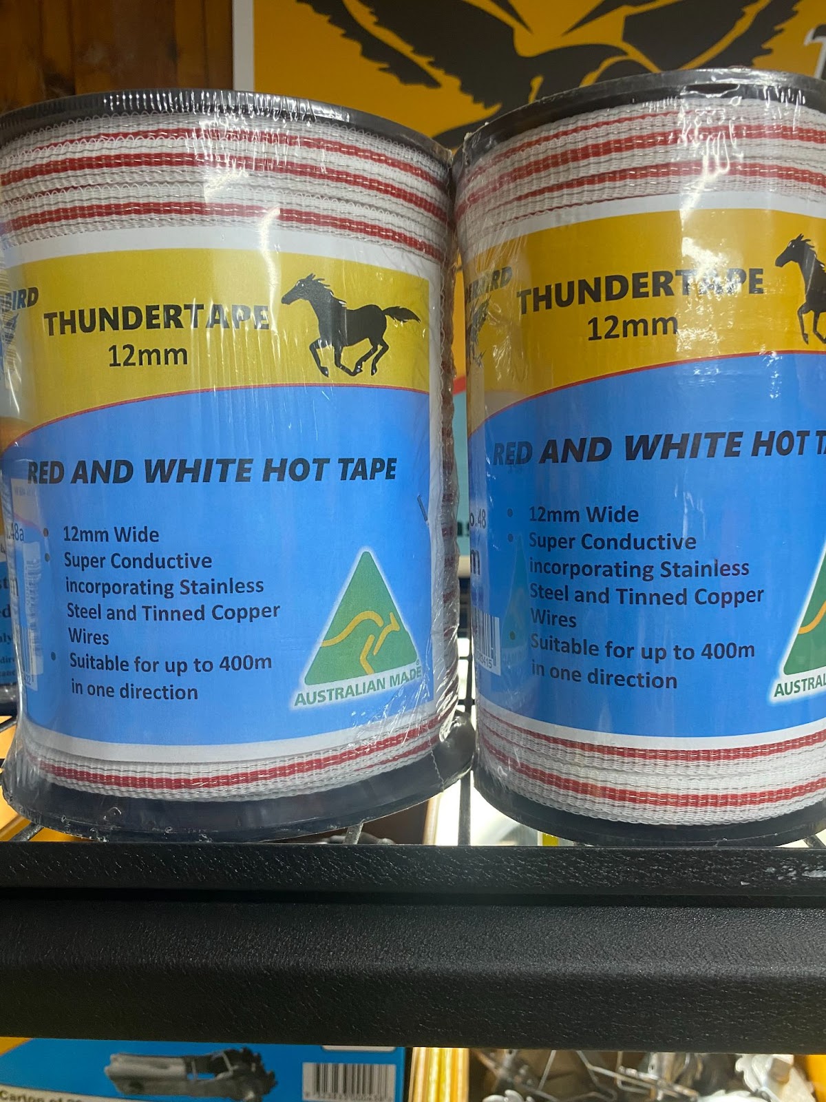 The Thunderbird Super Conductive Thundertape 200m (EF‑48) is a high-visibility electric fence tape designed for short-distance applications, making it ideal for portable or temporary fencing setups. Its 12mm wide woven design with 5 stainless steel wires ensures excellent conductivity while remaining highly visible to livestock.