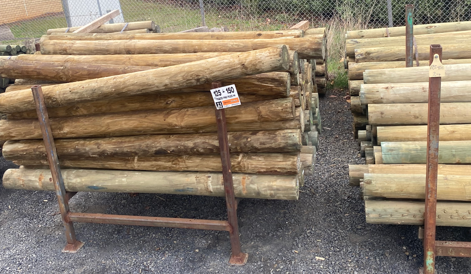 Round wooden post, typically from a young tree, with its bark removed to give it a more rustic and natural appearance, often for farm or garden fencing.